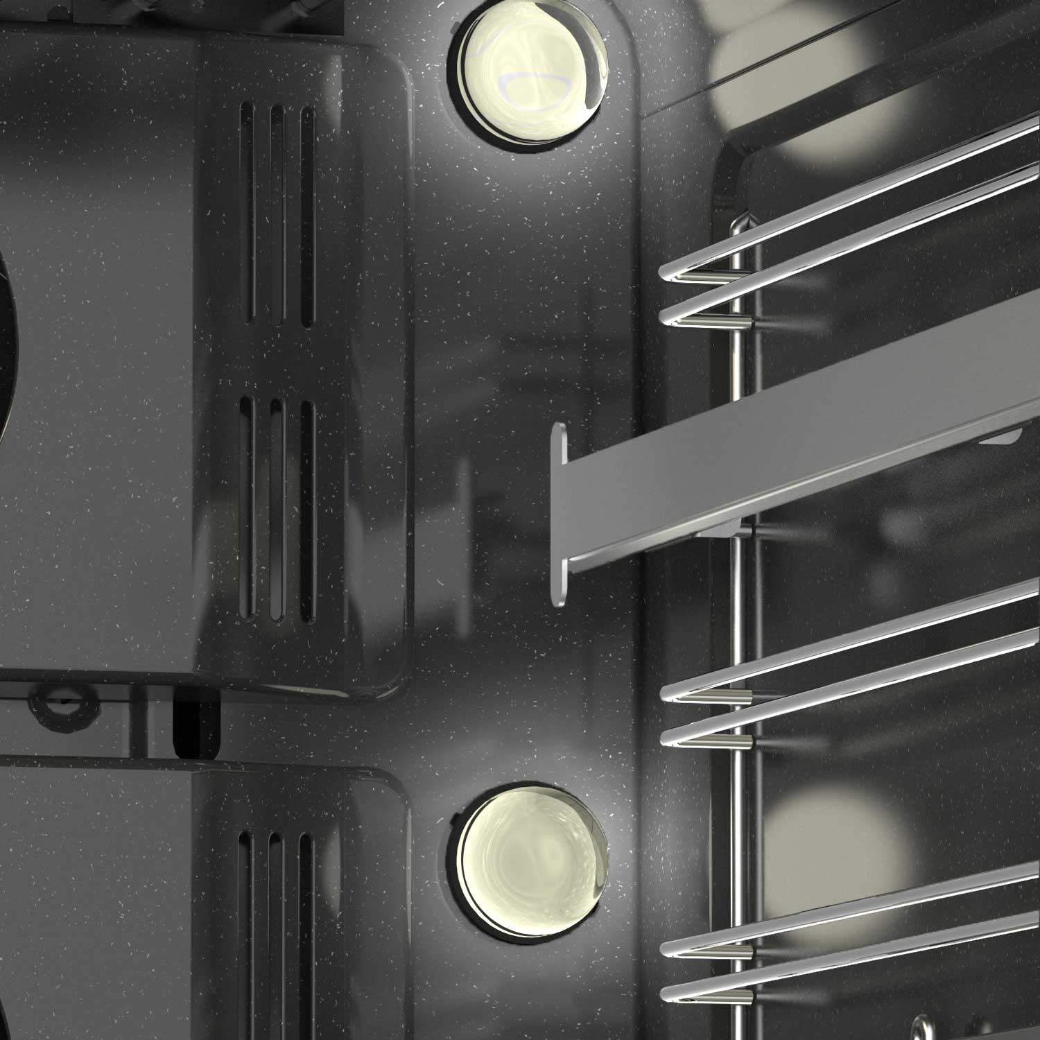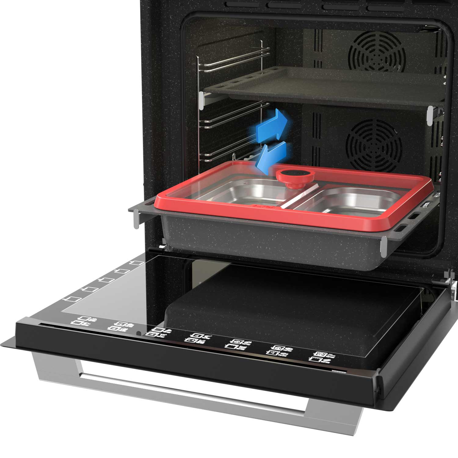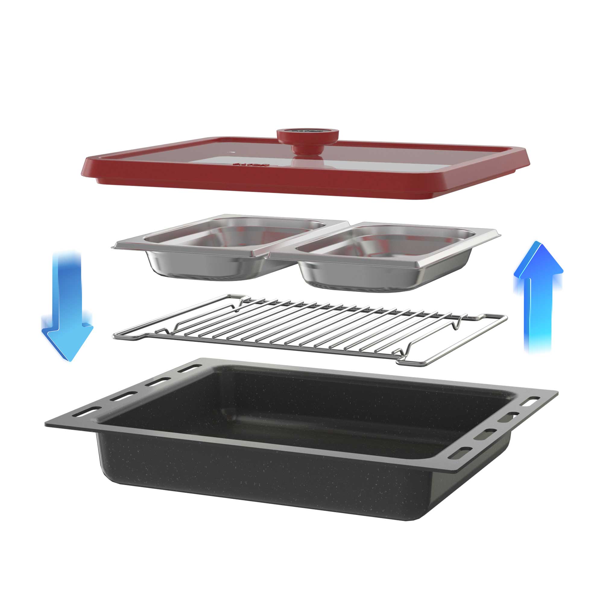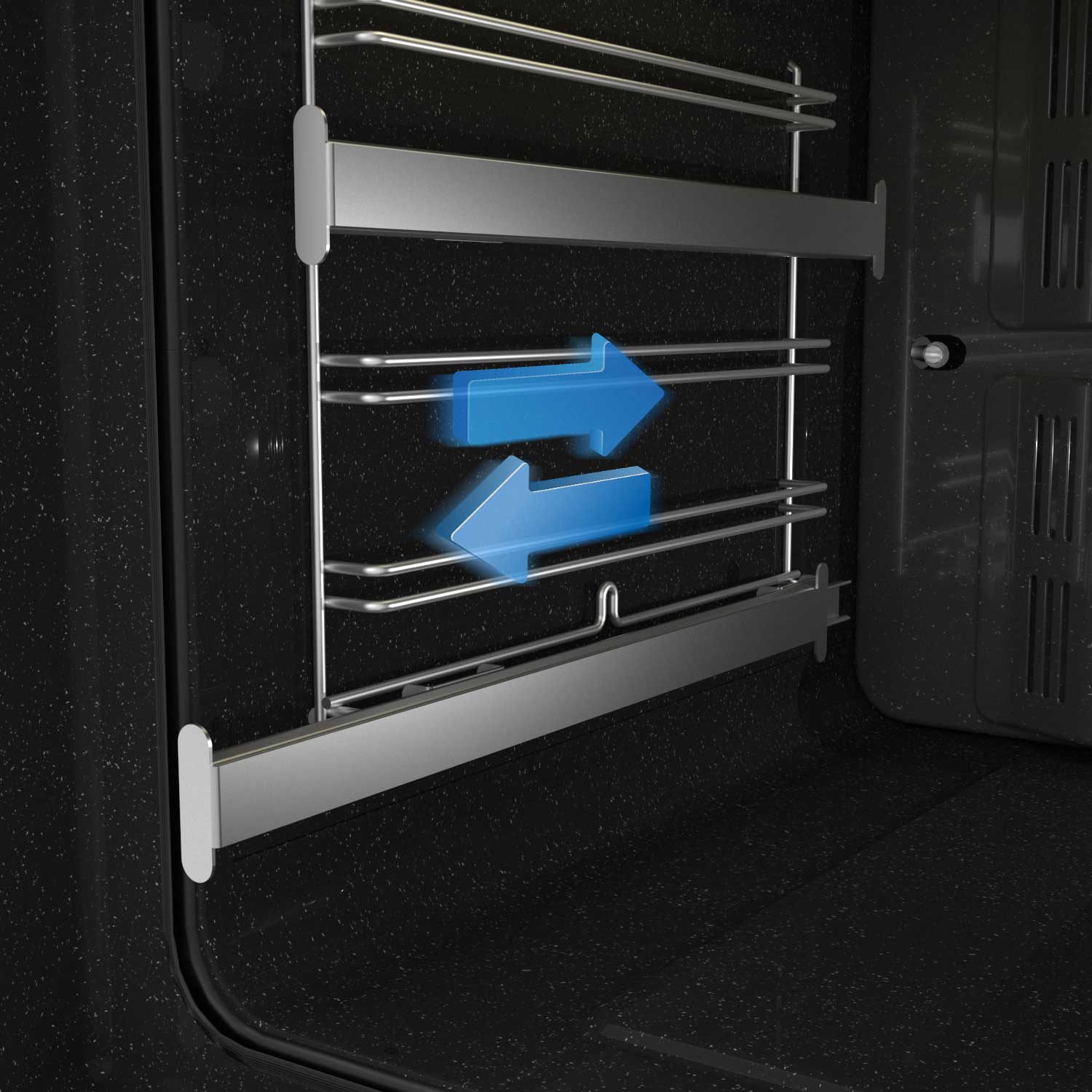 فر V550TG دارای ۴ عدد ریل تلسکوپی است که بیرون آوردن و جابه‌جایی سینی‌ها را بسیار راحت و ایمن می‌سازد. این ریل‌ها باعث می‌شوند حتی ظروف سنگین نیز بدون زحمت و خطر از داخل فر خارج شوند. همچنین وجود ۲ عدد سینی عمیق و کم‌عمق به شما امکان می‌دهد تا هم‌زمان انواع غذاها را بپزید و آشپزی خود را سرعت ببخشید.