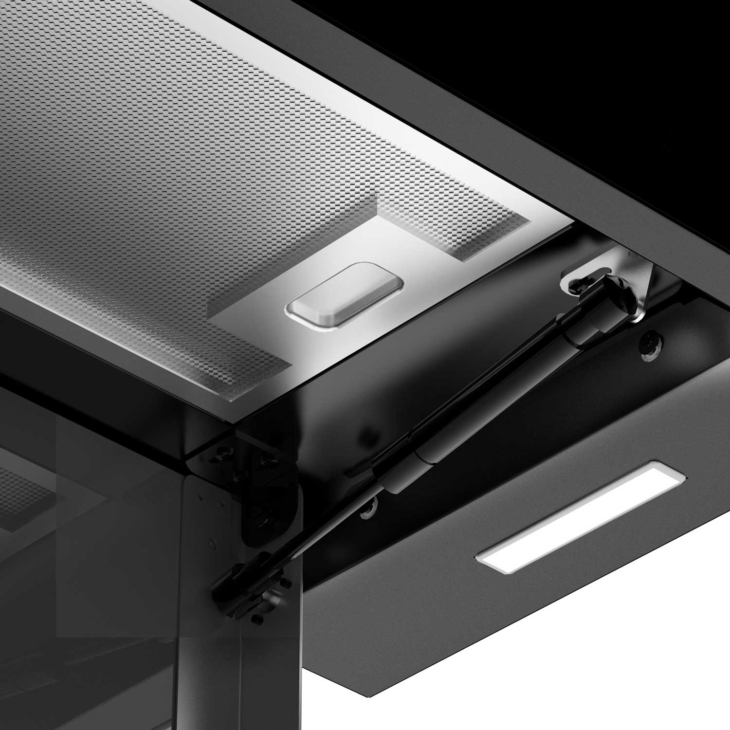 هود توکار H830B با عرض ۸۰ سانتیمتر و طراحی مخفی، کاملاً داخل کابینت نصب میشود و نمایی یکدست، مینیمال و لوکس به آشپزخانه میبخشد. ترکیب شیشه مشکی با فریم استیل، جلوهای مدرن ایجاد میکند که همسو با ترندهای جهانی طراحی لوازم آشپزخانه است و در عین حال با سلیقه ایرانی نیز هماهنگی کامل دارد.